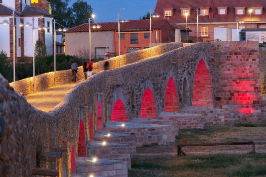 Ich breche im Dunkeln auf. Auch in Valverde ist es noch dunkel. Einige Pilger verlassen gerade die dortige Herberge. Norbert überholt mich. In San Miguel ist auch noch alles dicht. In Villadangos del Paramo ist wieder wie im letzten Jahr Mittelaltermarkt, aber auch hier schläft noch fast alles. In meinem letztjährigen Hostal bekomme ich dann doch noch einen Cafe con Leche. Wie in den letzten Tagen wird es wieder sehr warm. Über San Martin erreiche ich Puente de Orbigo und über die wunderschöne Brücke dann Hospital de Orbigo. Mittags treffe ich wieder Norbert zu einem Bier. Da Sonntagnachmittag ist, ist es mit Einkaufen für die nächste Etappe schwierig. Auch ein Kirchenbesuch ist an diesem Sonntag nicht möglich. Am Abend treffe ich Dino aus Genua zu einem gemeinsamen Fototermin auf der Brücke.