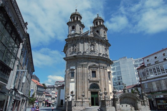 Wir haben uns an das frühe Aufstehen gewöhnt – zumindest tun wir so -- und gehen um 6.10\,Uhr los. Es ist noch frisch und auch etwas bewölkt, also ideales Pilgerwetter. Heute laufen wir mit einer neuen Taktik. Lucie und Nico gehen mit Lorenz, Hannah mit Andrea, Anna mit mir, der Rest nach Belieben. Beim Erreichen der Anhöhe vor Arcade können wir einen kurzen Blick auf die Ria (=Meeresbucht) werfen. In einiger Entfernung können wir die große Brücke von Vigo erkennen. Nach Überqueren der Brücke von Sotomayor gehen wir nach der Durchquerung des Dorfes einige Meter in die falsche Richtung, um eine gemütliche Frühstücksrast einzulegen. Die Umleitung vom letzten Jahr existiert nicht mehr. Wir können den normalen Weg gehen. Es nieselt ein paar Minuten schwach, stört aber eigentlich nicht. Der Weg ist heute zumeist landschaftlich sehr schön, manchmal hügelig, aber immer gut machbar. Am Kiosco Pelegrin machen wir eine zweite ausgiebige Rast. Unter der Kiwi-Laube sitzen wir ganz gut. Später halten wir noch kurz in der Kapelle des hl. Martin in Bertola. Der Schluss der heutigen Etappe verläuft dann auf eher ruhigen Nebenstraßen. Bereits gegen 12.00 Uhr treffen wir in Pontevedra in der Herberge ein. Wir müssen also 90\,Minuten warten, bis man uns aufschließt. Wir beschließen, dass ein Teil unserer Truppe das gegenüberliegende Restaurant vortestet. Die Herberge ist in einem sehr guten Zustand; leider liegt sie äußerst ungünstig. Um in die Stadt zu gelangen muss man mit ca. 3 Kilometer für Hin- und Rückweg rechnen. Das heißt, wir müssen den Nachmittag genau planen. Zuerst gilt es aber, die junge Dame am Empfang der Herberge zu überstehen. Wir hatten alle von ihr das Gefühl, dass sie keine Lust hatte und dann ausgerechnet heute so viele Pilger kommen. Immerhin gibt es eine Waschmaschine und einen Trockner. Als wir den Preis erfahren - jeweils 6 Euro - können wir es kaum glauben. Insgesamt zahlen wir für einmal waschen und zweimal trocknen - die Wäsche war nach einmal trocknen noch nass – 18 Euro. Wie besprochen gehen wir um 16.00 Uhr in die Stadt.